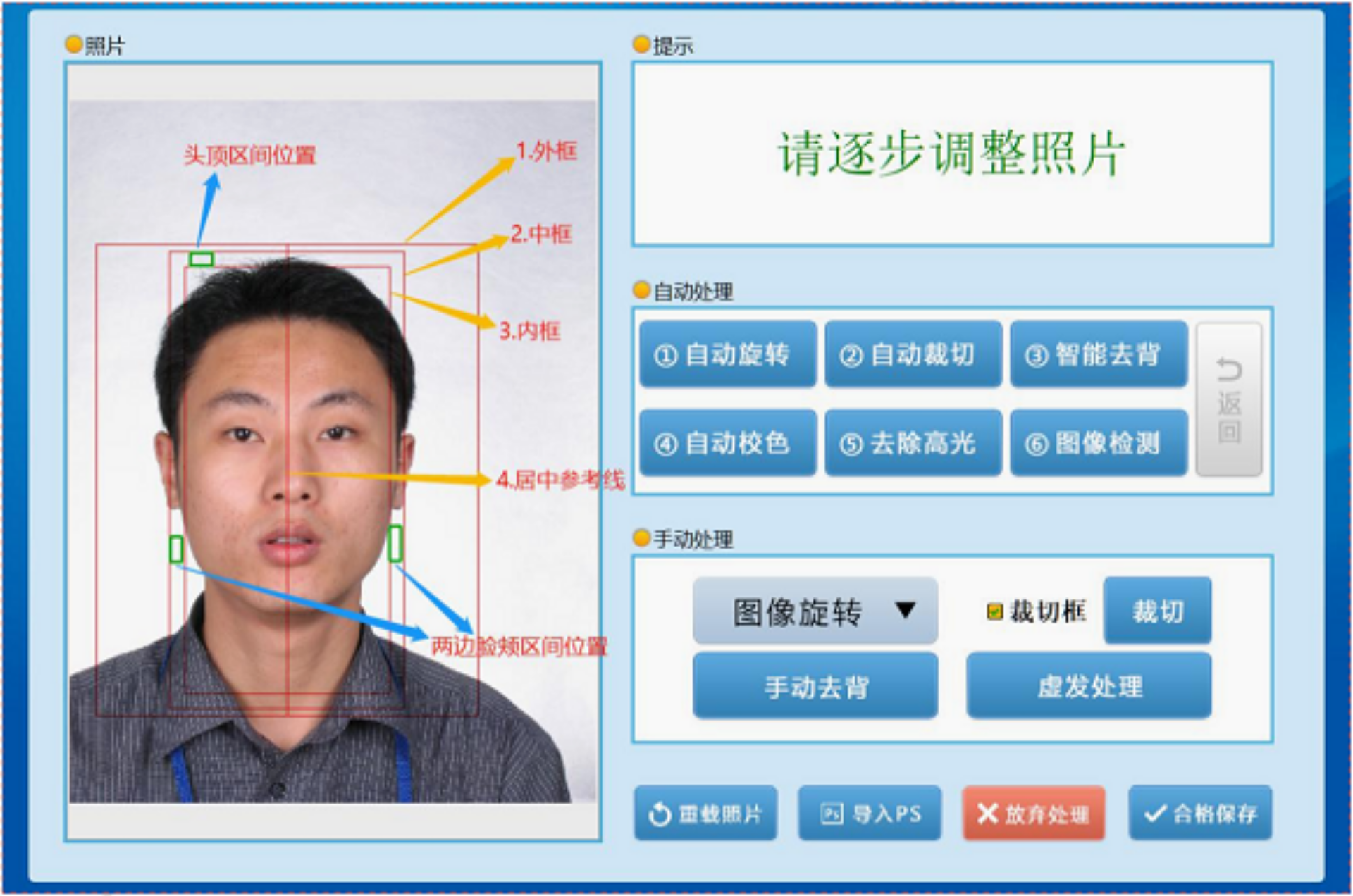 5.提供手動(dòng)去背、裁切、調(diào)色、檢測(cè)的功能。