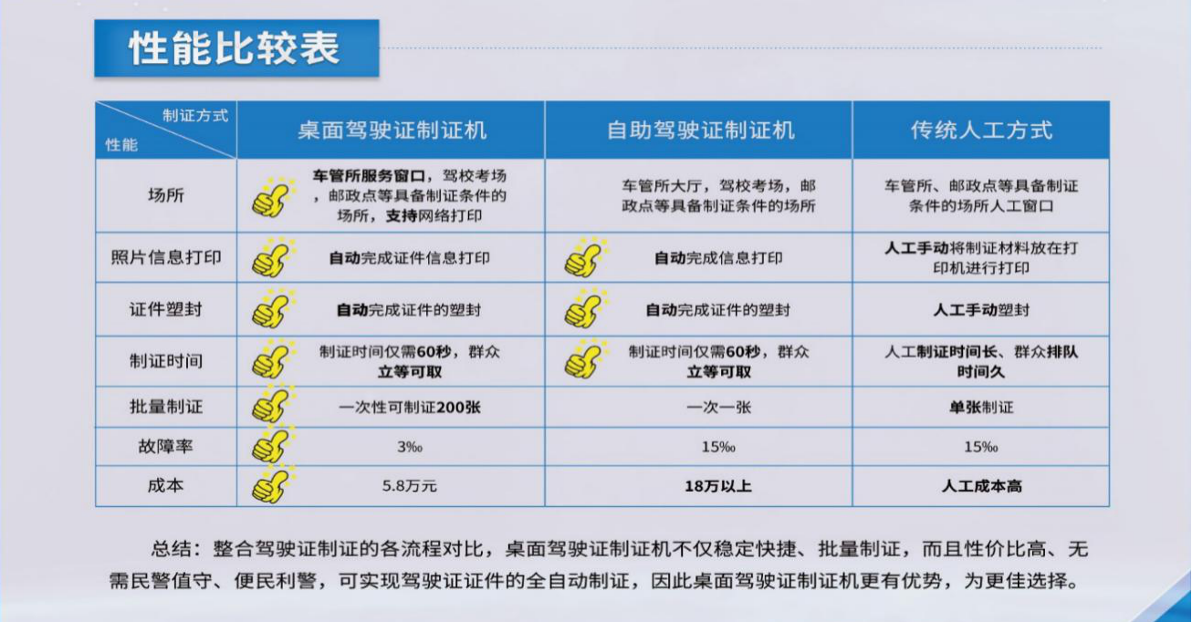 目前車輛管理所對駕駛證首次申請、換發(fā)、補發(fā)等類型普遍實行“當日內發(fā)證”。倘若將駕駛證“當日內發(fā)證”變?yōu)椤傲⒌瓤扇 ?,一方面徹底解決群眾往返兩次車管所申請與領證,另一方面減輕前臺窗口民警工作壓力。桌面式駕駛證制證機的誕生徹底的解決了這一痛點,