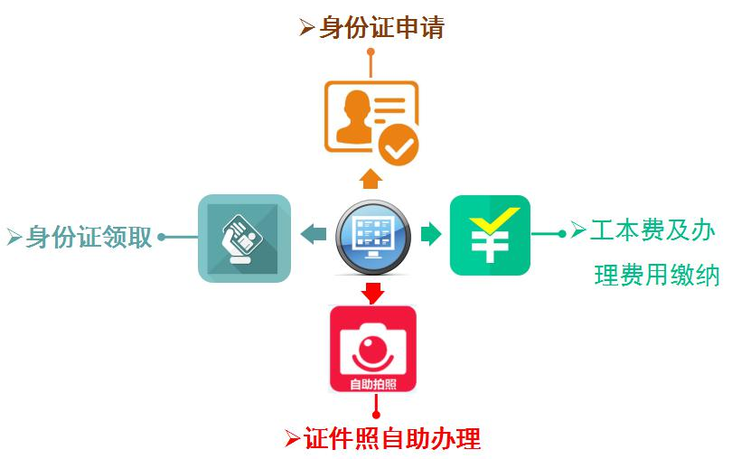 戶政多功能一體機(jī)可辦理證件照自助拍照、身份證自助申請、身份證自助領(lǐng)證、自助繳費四大業(yè)務(wù),具體如下圖所示: