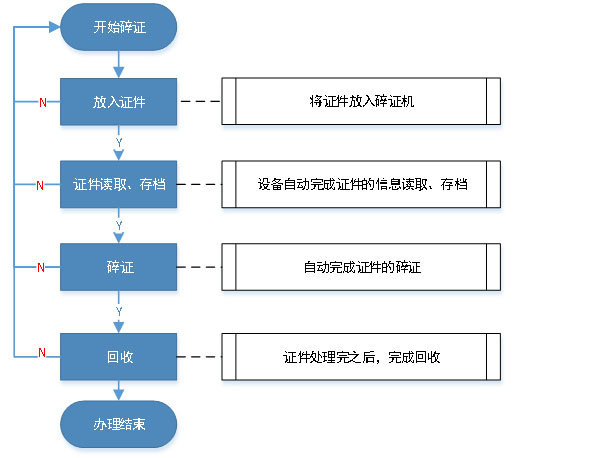 證件放入碎證機(jī)后,設(shè)備自動(dòng)將證件傳送到身份證信息讀取模塊、自動(dòng)完成信息讀取、存檔;并自動(dòng)完成碎證處理,實(shí)現(xiàn)證件無(wú)效,處理完畢后,失效證件自動(dòng)到回收箱。