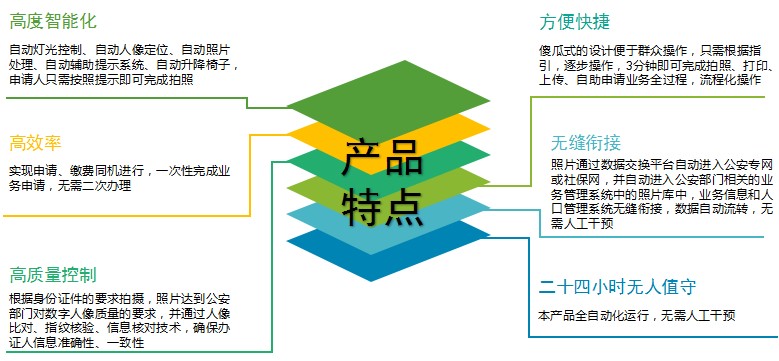 b)全自動拍照:無需手動按拍照按鈕或點擊屏幕拍照,程序控制3)自動定位人像,拍照人只需要根據(jù)語音指引坐端正,自動拍照,無需人工操作。