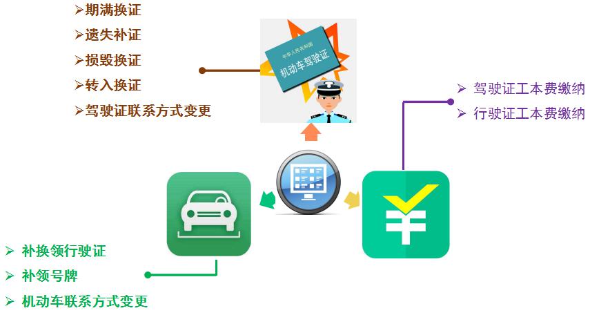 車駕業(yè)務自助申請機可辦理駕駛證、機動車業(yè)務、自助繳費三大業(yè)務,具體如下圖所示:
