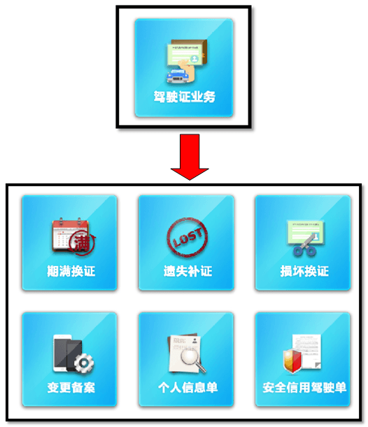 駕駛證自助辦證機(jī)可辦理駕駛證、交通違法兩大業(yè)務(wù),具體如下圖所示: