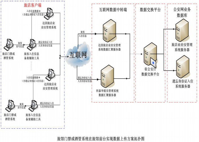 D. 門鎖發(fā)卡系統(tǒng)或酒管系統(tǒng),在發(fā)卡成功后自動(dòng)將房號(hào)傳輸給遺忘身份證入住系統(tǒng)。遺忘身份證入住系統(tǒng),將發(fā)卡記錄以及遺忘身份證入住信息傳輸至公安內(nèi)網(wǎng)。