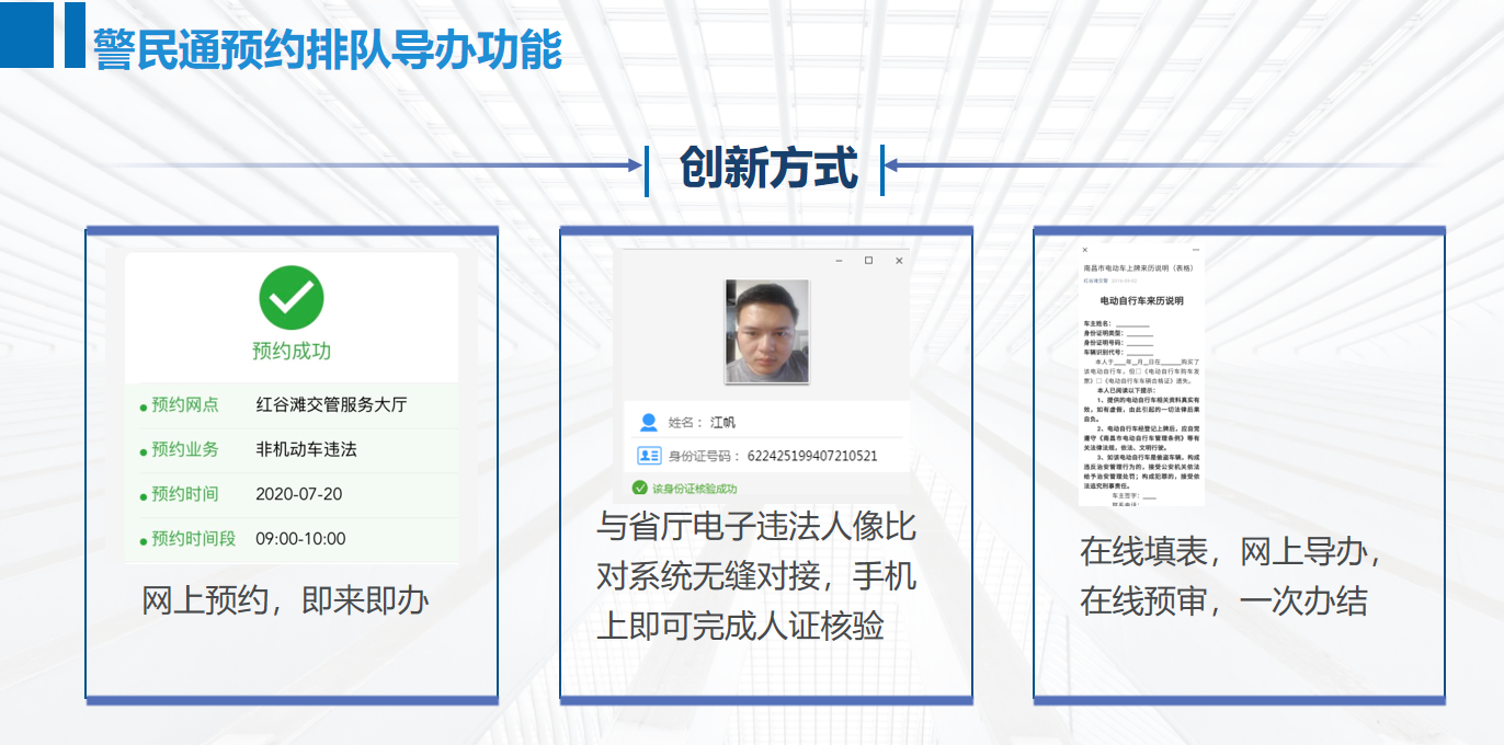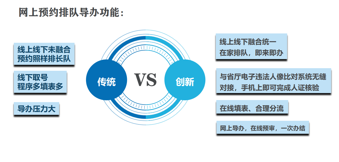 平臺(tái)可部署到全市分所,形成立體化服務(wù)網(wǎng)絡(luò),打造“車管所智 慧云導(dǎo)航系統(tǒng)” ,依托微信公眾號(hào),匯聚群眾所需辦理的業(yè)務(wù)類型、 自動(dòng)判斷業(yè)務(wù)規(guī)則、地理位置信息、網(wǎng)點(diǎn)服務(wù)能力、群眾年齡、身份 等數(shù)據(jù)形成“大數(shù)據(jù)模型”,智能推薦群眾前往距離最近、時(shí)間最短 的分所或自助設(shè)備上辦理業(yè)務(wù)。最終實(shí)現(xiàn)群眾網(wǎng)上辦、就近辦、一次 辦的目標(biāo),同時(shí)將現(xiàn)在車管所從門庭若市到門可羅雀的轉(zhuǎn)變。