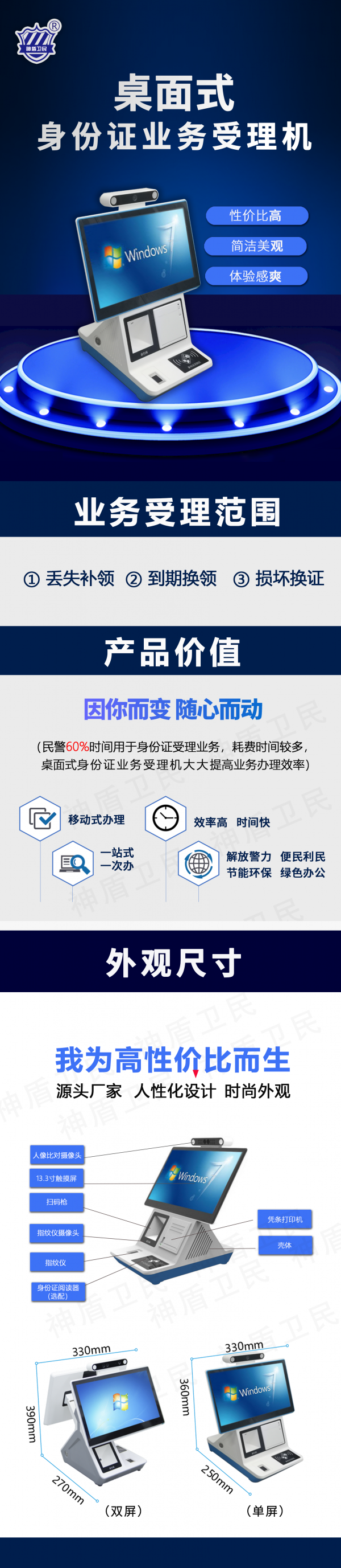 桌面式身份證業(yè)務(wù)受理機為神盾衛(wèi)民最新研發(fā)的身份證業(yè)務(wù)受理申請一體機,辦理業(yè)務(wù)包括身份證的丟失補領(lǐng)、到期換領(lǐng)、損壞換證等,其可擺放在辦公桌面提供給群眾24小時服務(wù),具備性價比高、簡介美觀、群眾體檢好等特點,大大提升了民警的工作效率和