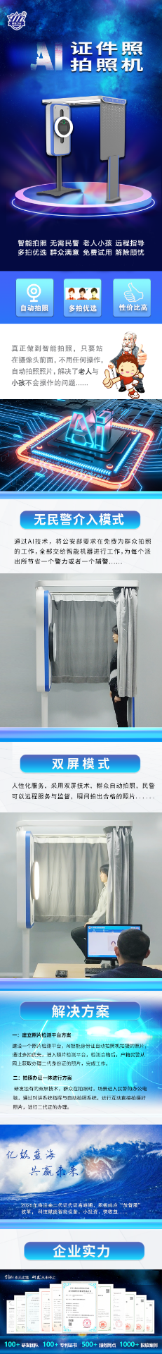AI證件拍照機(jī)為神盾衛(wèi)民公司自主研發(fā)AI智能終端,目前有兩款分為單屏和雙屏兩種模式,操作“傻瓜式”,老少皆宜,用戶通過(guò)語(yǔ)音提示和屏幕操作,即可自行完成拍攝,多拍優(yōu)選,全程只需1分鐘??蔀槊總€(gè)派出所節(jié)省一個(gè)警力或輔警。