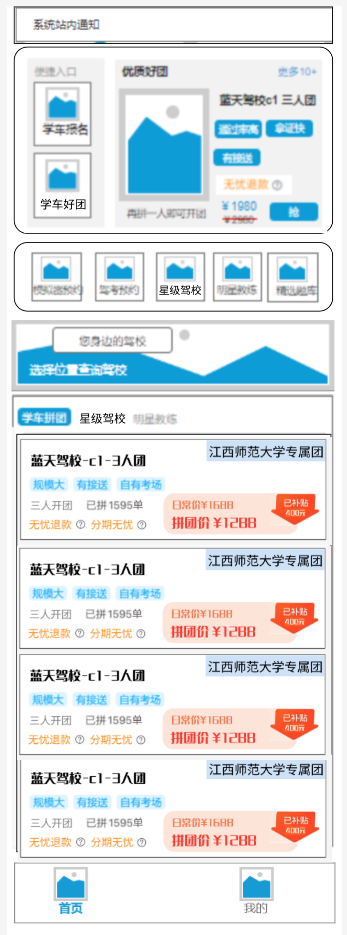 10.底部列表tab欄:點(diǎn)擊tab欄切換查看學(xué)車拼團(tuán)列表,推薦駕校列表,明星教練列表