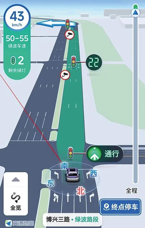 7月25日,記者駕車到公安部道路交通安全研究中心采訪。當(dāng)日9時(shí)53分,當(dāng)車輛行駛到北京經(jīng)濟(jì)技術(shù)開發(fā)區(qū)博興三路時(shí),車載電子導(dǎo)航語音提示:“前方進(jìn)入綠波路段,按照時(shí)速50公里至55公里,可連續(xù)通行三個(gè)路口。”記者按照提示,果然所到路口都是綠燈,順利通過。