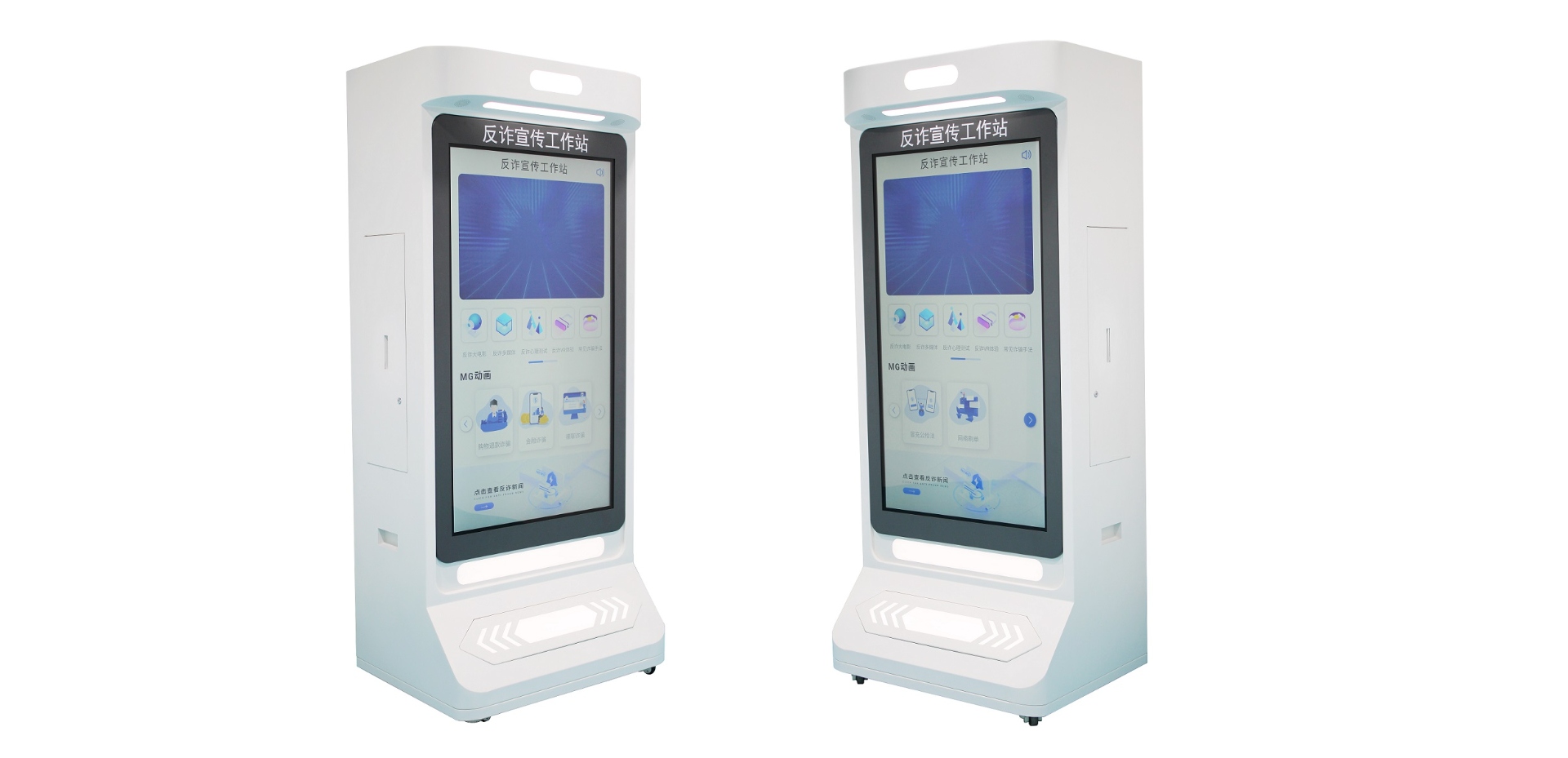 反詐宣傳工作站設(shè)備,采用大屏觸控技術(shù)與AR技術(shù)相結(jié)合的模式,是一款能為民眾提供沉浸式反詐宣傳的便民服務(wù)終端。實(shí)時電話現(xiàn)場詐騙、VR詐騙、詐騙知識科普、詐騙案例警示、詐騙測評功能,具有實(shí)時監(jiān)測瀏覽量、考核情況分析等功能。